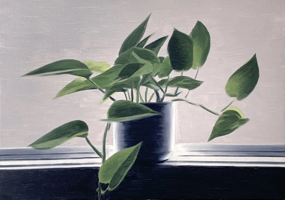 This series was initially formed by four paintings, each based on an anecdotal photograph of a solitary house plant, situated on an otherwise empty window ledge, shot at a particular time of day or night: afternoon, evening, midnight, and morning. The plant functions as a type of perceptual prop, an armature to register the dramatic interplay of light and shadow over the four distinct intervals. Through his approach to facture, Ostoff deliberately built up each painting through layers of translucent pigment, in ostensibly realistic but slightly exaggerated colours, while selectively removing certain details. This process effectively diminishes the specificity of the photographic source image, while retaining its pictorial trace, thereby defamiliarizing the prosaic nature of these otherwise homely scenes, and subtly destabilizing the seeming verity with which each painting would appear to depict its designated temporal juncture. Ostoff then made second versions of each of the four initial paintings. These subsequent versions are not exact replicas; rather, within each one, there is a more pronounced shift in colour, size and tone, further differentiating them from the originals, enveloped now within a more dynamically amorphous sense of duration, one that is intrinsic to both the nature of memory, and to painterly practice itself: at once elastic, recursive, and potentially without end.